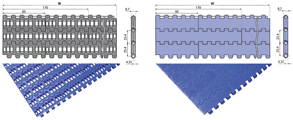 - این نوع زنجیرها در دو نوع ساده و سوراخدار تولید می شود. امروزه با توجه به قابلیتهای متنوع این نوع زنجیرها کاربرد بسیار وسیع در کلیه صنایع به ویژه صنایع غذایی و آشامیدنی، دارویی و بسته بندی دارند.